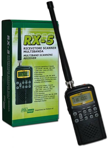 Le Polmar RX-5 est un récepteur portable à balayage de cinq bandes dans les basses et hautes fréquences VHF qui varient entre 25 et 174 MHz. Le scanner est conçu pour recevoir deux communications simultanées de radio émetteurs bidirectionnel dans les gammes standards de fréquences européennes et dans les systèmes à espacement de canal AM et en modulation bande étroite en FM.